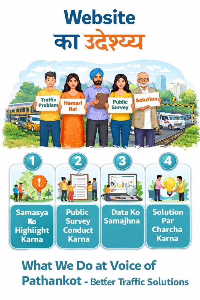Hum Pathankot se jude real local issues ko public surveys, local reports aur citizens ki participation ke through highlight karte hain. Hamara focus public opinion collect karna, traffic aur civic problems par awareness badhana, aur positive discussion ko promote karna hai.